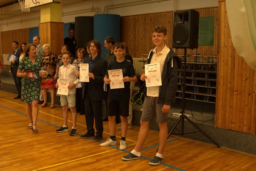 Poté již následovalo vyhlášení výsledků sportovního dne a ocenění mimořádných úspěchů našich studentů výročními cenami – Žlutými ponorkami (včetně malé finanční odměny), a to za úspěchy v krajských kolech olympiád a finálových (tj, celostátně organizovaných) soutěžích a projektech. Celkem bylo předáno 18 cen, měli jsme letos totiž řadu skvělých umístění – včetně historicky prvních: Jedná se o vítězství v překladatelské soutěži Juvenes translatores – Max Petrnoušek ze sexty, vítězství v celostátním kole soutěže programování mikrořadičů – Adam Špindler ze septimy, zisk Poháru vědy – družstvo K. Krejčová, N. Wildmanová, Š Janoušek a M. Hřebík